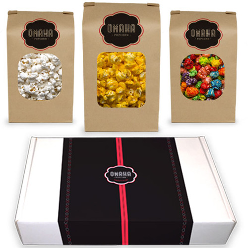 Delivered inside a nice Omaha Premium Gourmet Box which contains three bags: Classic Gourmet White (6 cups; 2oz.); Savory Cheddar (6 cups; 5.5oz.); Confetti Crave (6 cups; 9.5oz.)